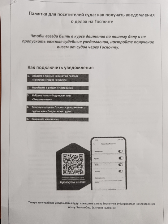 ![]() Информируем Вас, о преимуществах получения судебной корреспонденции (извещений, копий судебных решений и постановлений) в электронном виде через сервис ГЭПС. |